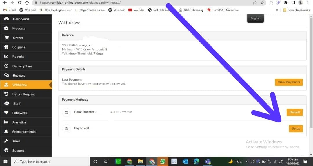 Click set up and it will take you to the payment set up setting, scroll down and put your cell phone number which is linked to your bank. Make sure the number you provide is linked with the bank you provided