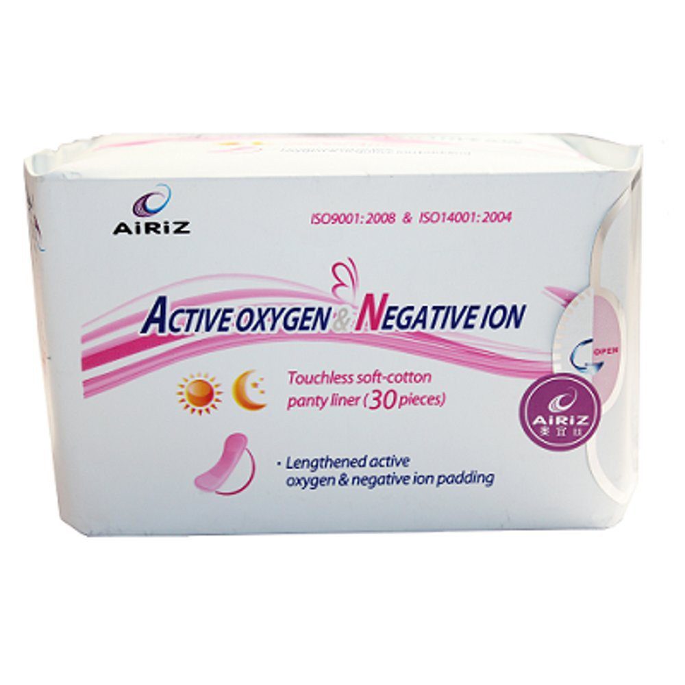 AIRIZ active oxygen & negative ion panty liner, with silk-thin soft cotton surface layer, it is comfortable, sanitary and absorbent. In addition, it has active oxygen & negative ion chips, which have such roles of preventing gynecologic diseases, adjusting blood circulation, enhancing immunity, sterilizing and eliminating odor. You can use it comfortably both before and after menstrual period.